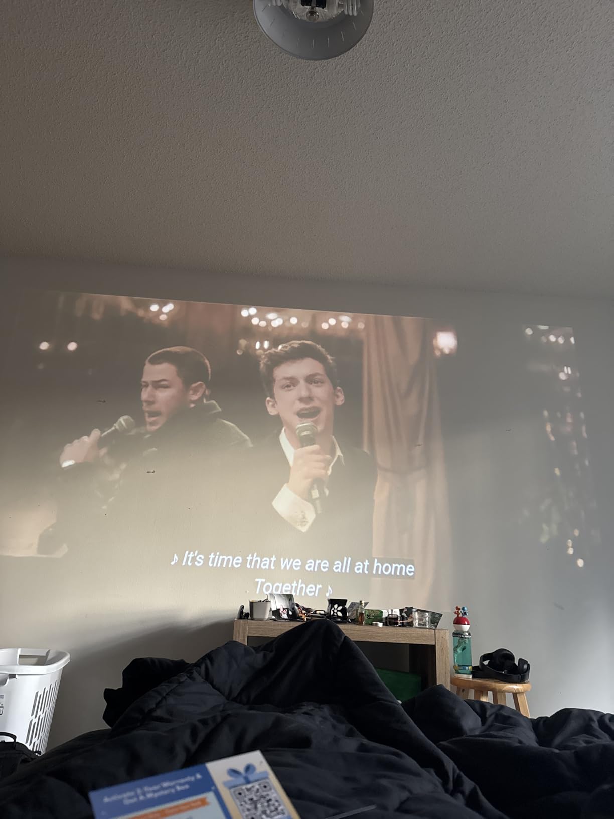 Sit back as the bright HD projection and built-in speakers deliver a cozy, immersive viewing experience.