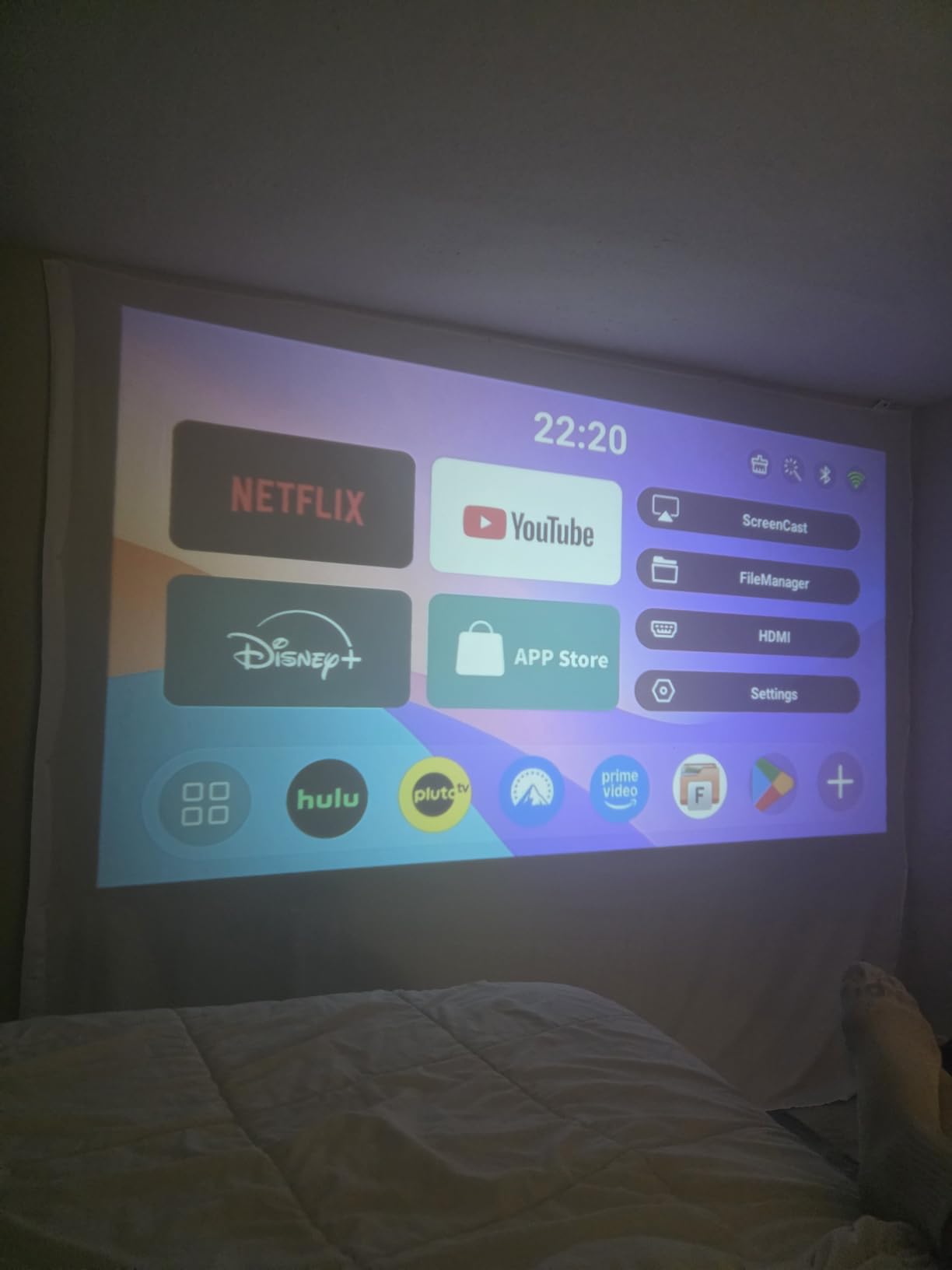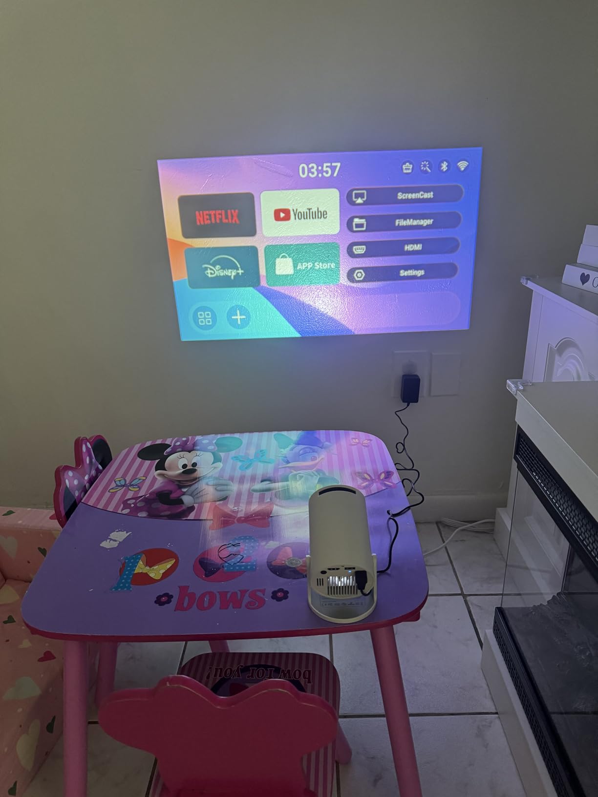 Place the projector on any flat surface, aim it at your wall or ceiling, and hit play — your space transforms instantly.