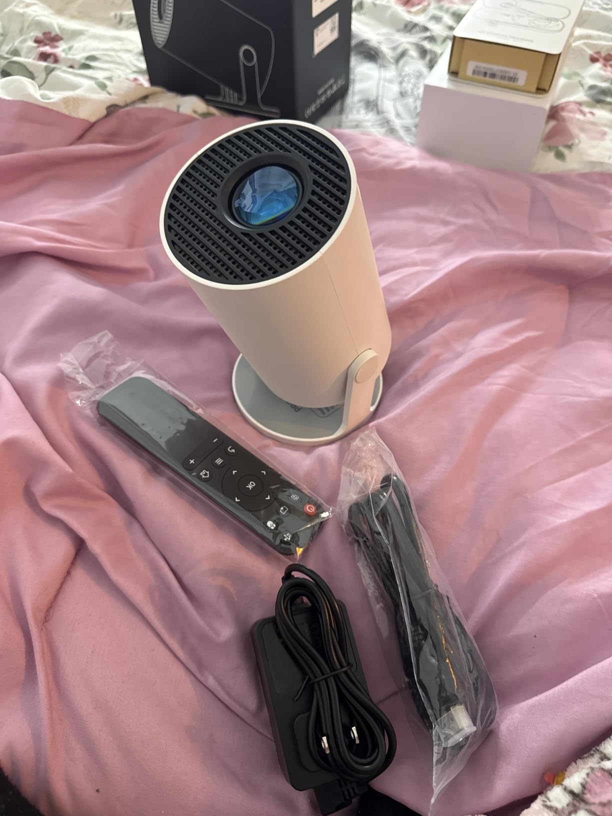 Plug in your projector using the included power cable, then turn it on with the remote — quick and easy.